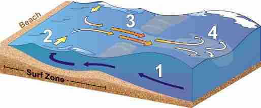 Rip currents are powerful, narrow channels of fast-moving water running from a beach back to the open ocean, sea, or lake, usually sustains for several minutes. Rip current can move up to 8 feet per second (more than 2 meters per second), which is much faster than even Olympic swimmers. They are usually caused by the fragmented tides created by radiation stress in water waves.